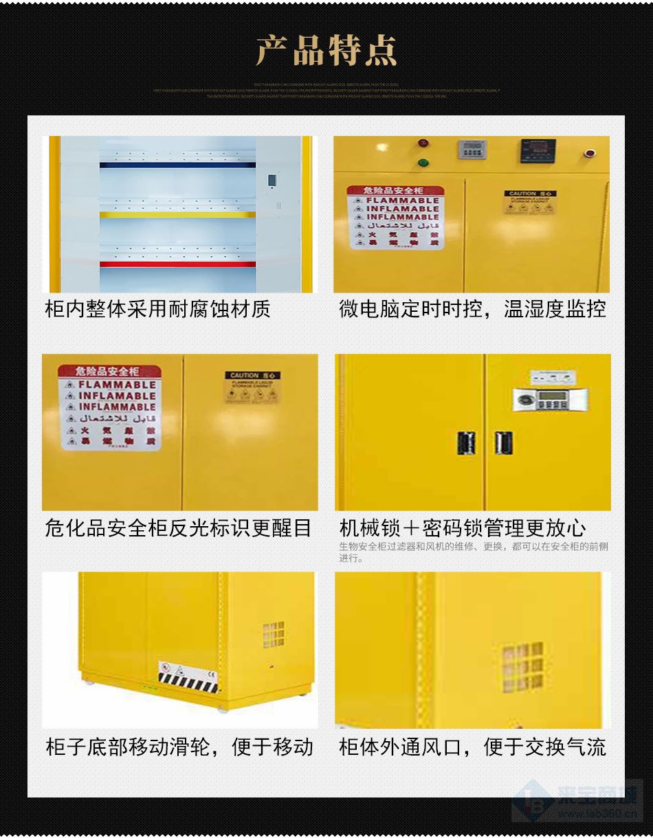 柜底裝有四個Φ60mm的移動鋼輪,便于易燃品毒害品儲存柜移動;