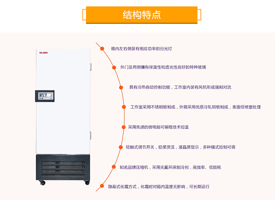 1、該產品箱內左右側裝有相應功率的日光燈,在外門及兩側鑲有保溫性和透光性良好的特種玻璃,以減少日光燈入射光的熱量傳入,既滿足室內樣品所需光照度,同時便于觀察。具有冷熱自動控制功能,工作室內裝有風機形成強制對流,使工作室內平均溫度更好,整機工藝先進,工作室采用不銹鋼板制成,外箱采用優質冷軋鋼板制成,表面經噴塑處理,箱體造型美觀大方
