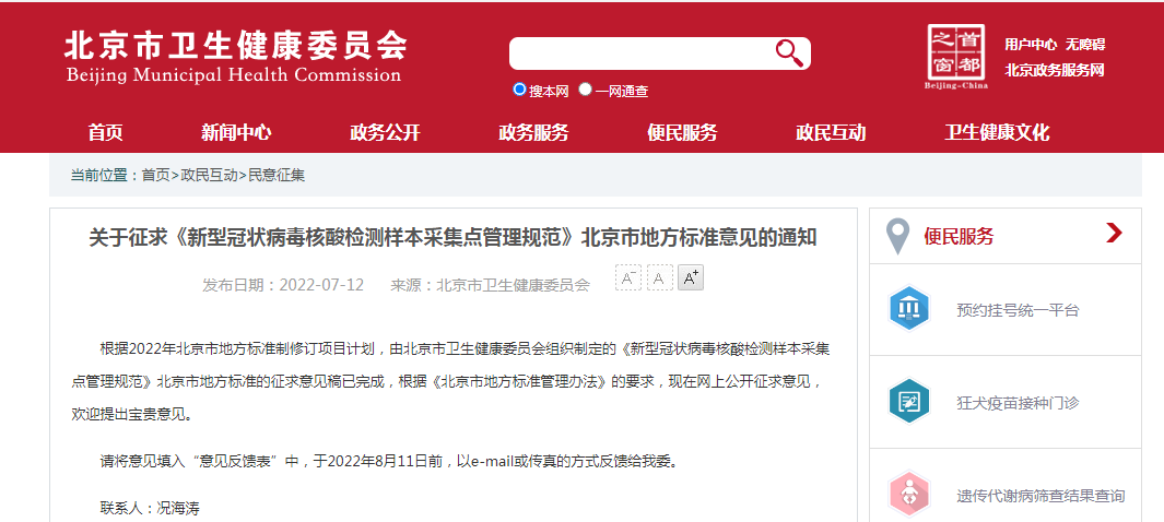 日前,據(jù)北京市市場(chǎng)監(jiān)督管理局網(wǎng)站消息,北京市衛(wèi)生健康委員會(huì)組織制定的《新型冠狀病毒核酸檢測(cè)樣本采集點(diǎn)管理規(guī)范》,說明了新型冠狀病毒核酸檢測(cè)樣本采集點(diǎn)的基本要求、采集點(diǎn)設(shè)置、設(shè)施設(shè)備及物品、人員要求、樣本采集、樣本保存及運(yùn)輸、醫(yī)療廢棄物處理、環(huán)境消殺等多方面做出要求,指導(dǎo)北京的核酸采樣管理。