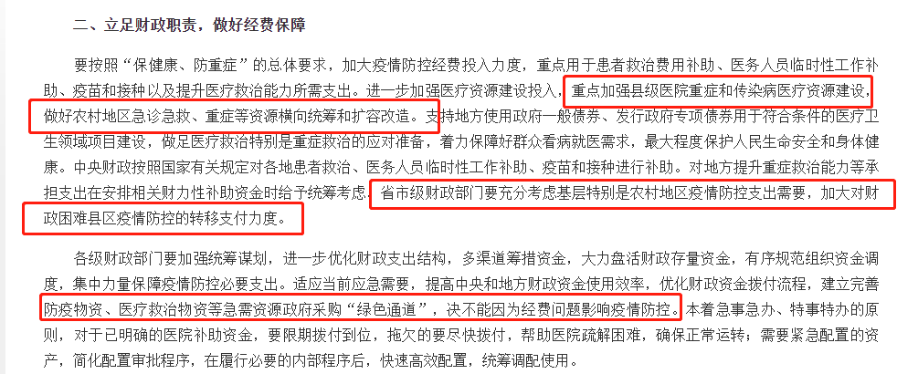 各級財政部門要進一步加強醫療資源建設投入,重點加強縣級醫院重癥和傳染病醫療資源建設,做好農村地區急診急救、重癥等資源橫向統籌和擴容改造。