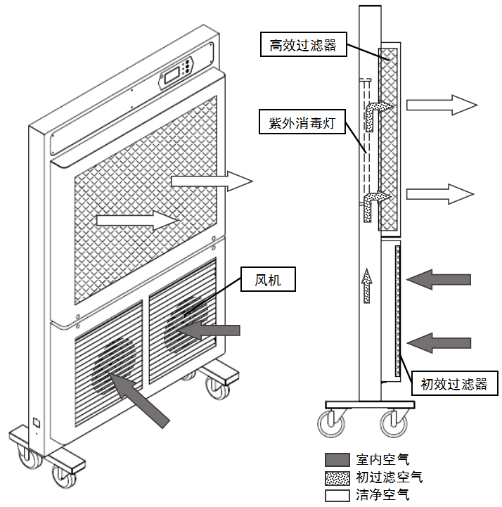 BIOBASE/博科紫外線空氣消毒器是利用風(fēng)動系統(tǒng)將室內(nèi)污濁的空氣吸入設(shè)備中,經(jīng)過濾系統(tǒng)、殺菌系統(tǒng)對吸入的空氣進(jìn)行凈化消毒處理后放回室內(nèi),通過不斷的循環(huán)使室內(nèi)空氣質(zhì)量逐步提升到一定潔凈等級,以達(dá)到去除室內(nèi)有害氣溶膠、保護(hù)人員健康的目的。