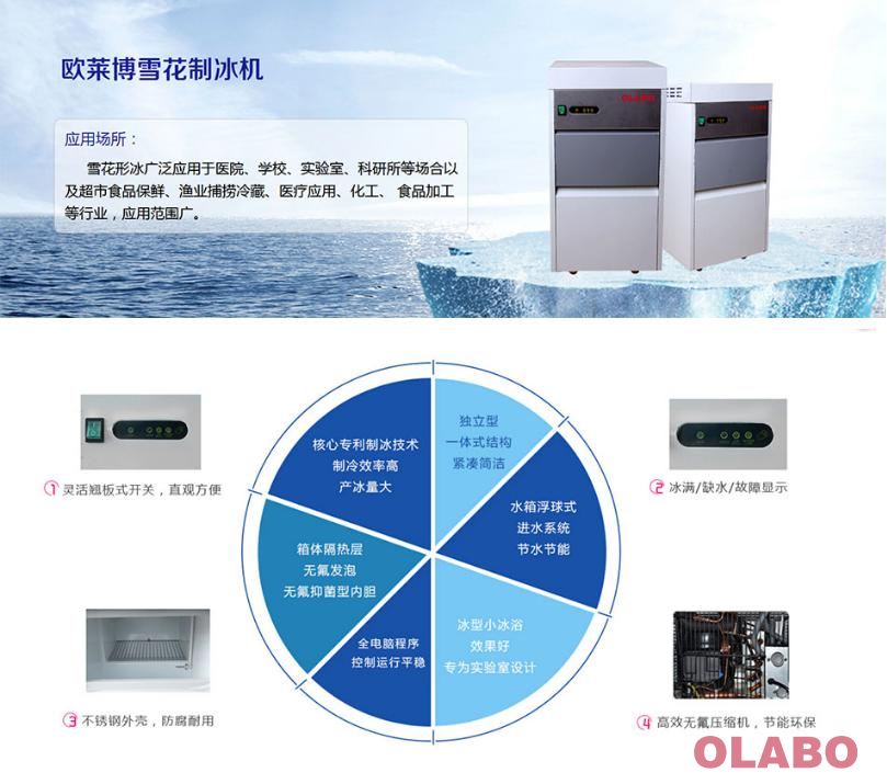 ● 所制冰形為不定形的細(xì)小顆粒狀雪花碎冰,冰形小,能滲入較窄間隙, 冷卻速度快,冰浴效果好,專為實驗室設(shè)計。
